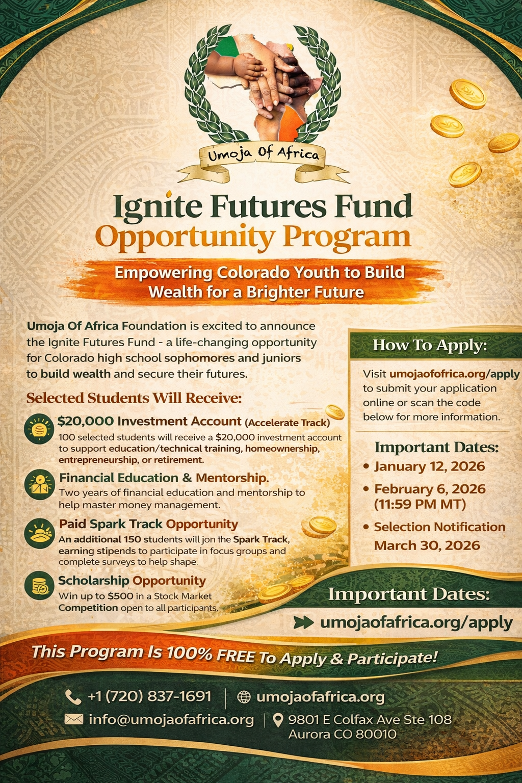 This program is completely free to apply and open to eligible Colorado youth regardless of immigration status. The Ignite Futures Fund is committed to equity, inclusion, and creating pathways for young people to actively participate in the wealth economy and shape brighter futures for themselves and their communities.